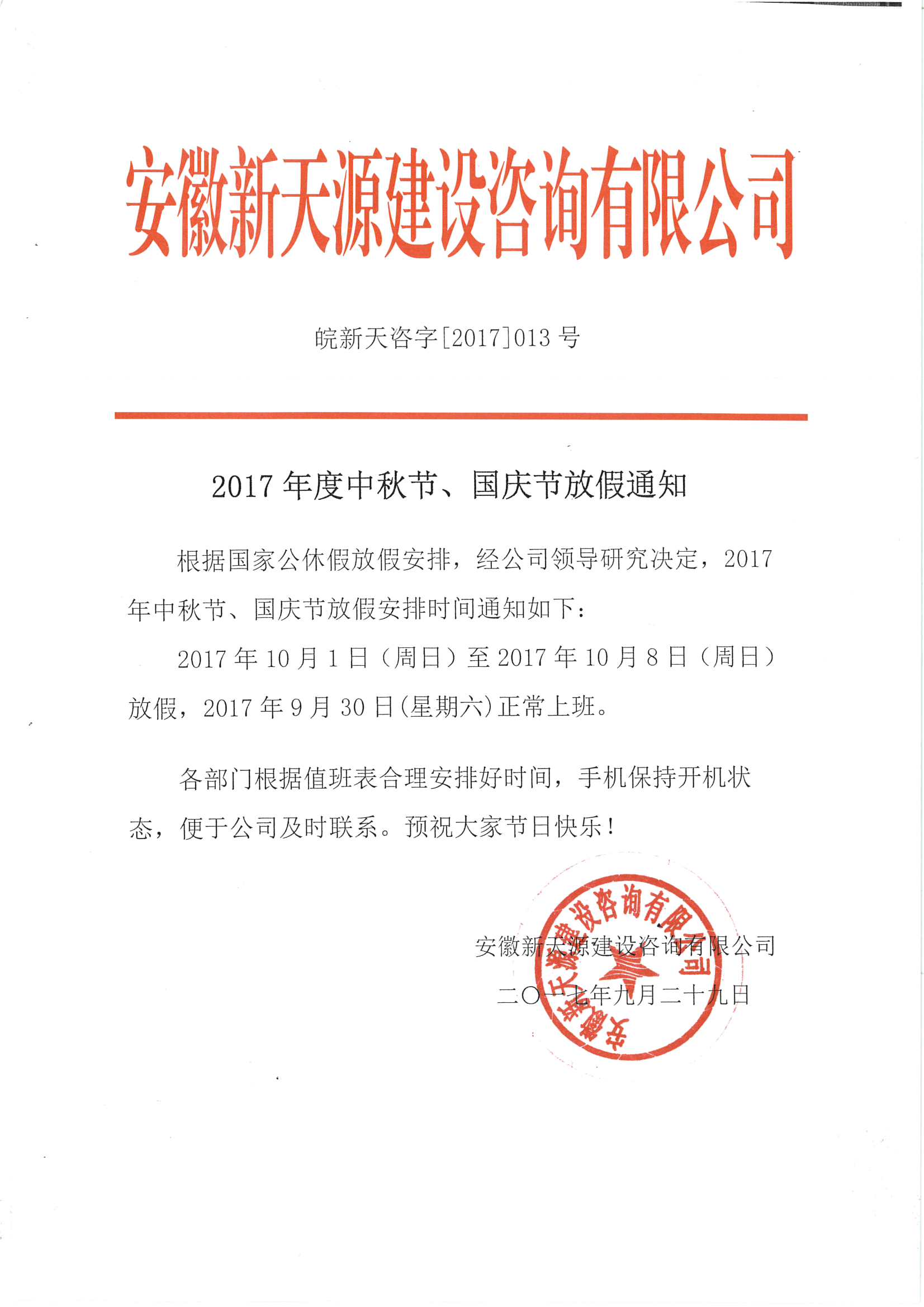 - 2017年度中秋節、國慶節放假通知